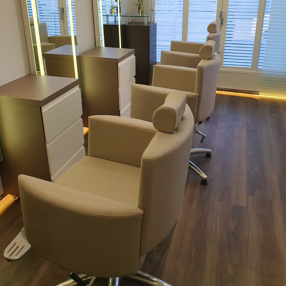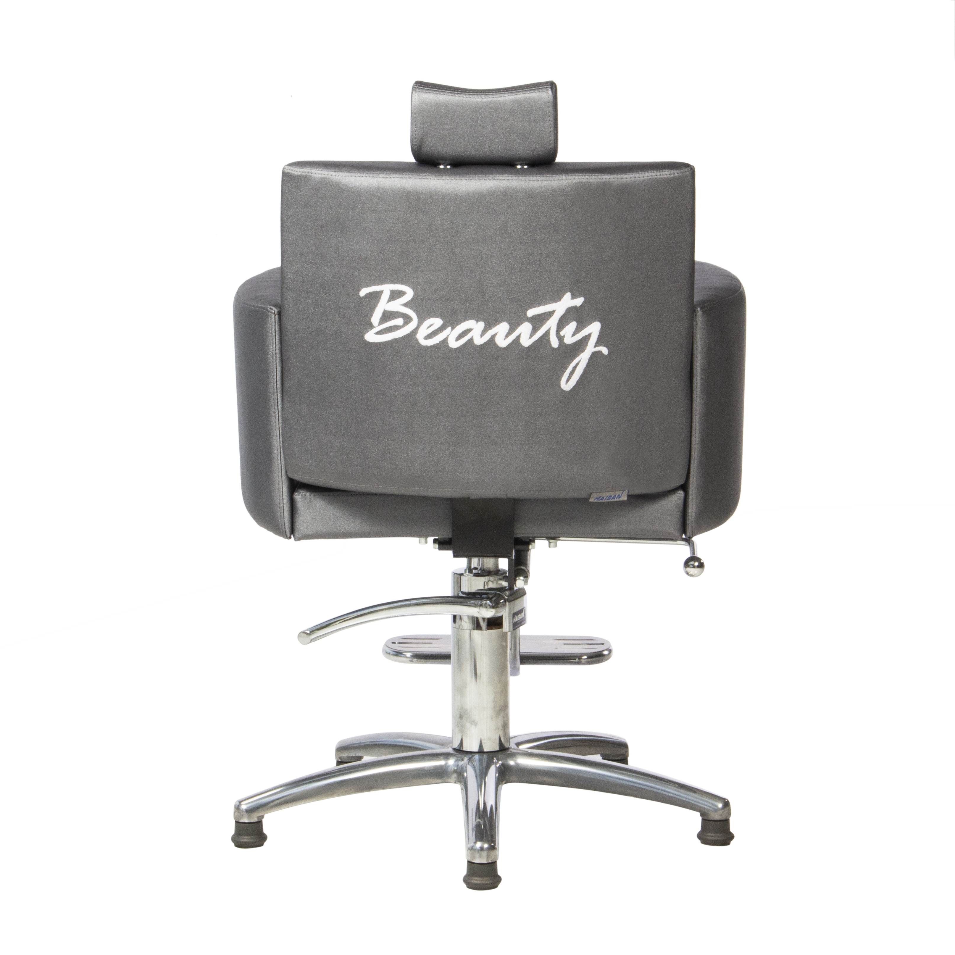 A cadeira de salão de beleza Helena foi criada pela equipe de design da Haisan para permitir a personalização da sua marca no seu espaço, com aplicação de bordado nas costas da cadeira, à sua escolha, sem custo adicional.