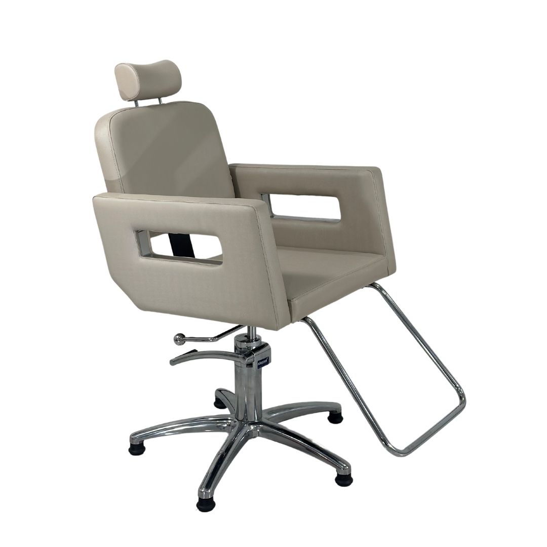 A poltrona para corte Roma é confortável e prática, com linhas modernas e cantos arredondados, para maior leveza, realçados pelos detalhes de aço inox cromado nos braços.