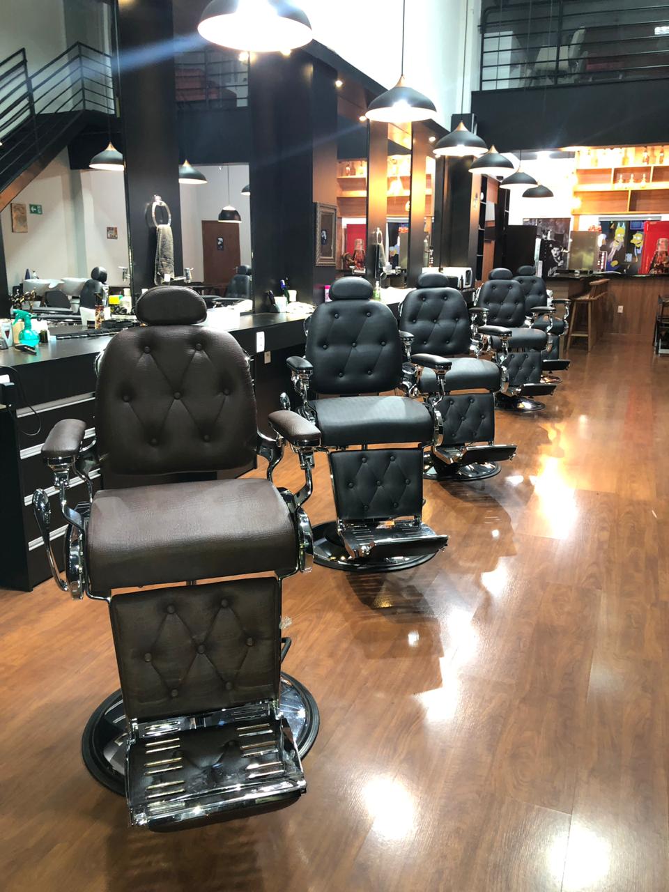 Nero é poltrona para barbearia, para ambientes que vão do vintage ao retrô. Linhas elegantes e estofamento com capitonê no encosto e apoio de pernas valorizam a cadeira.