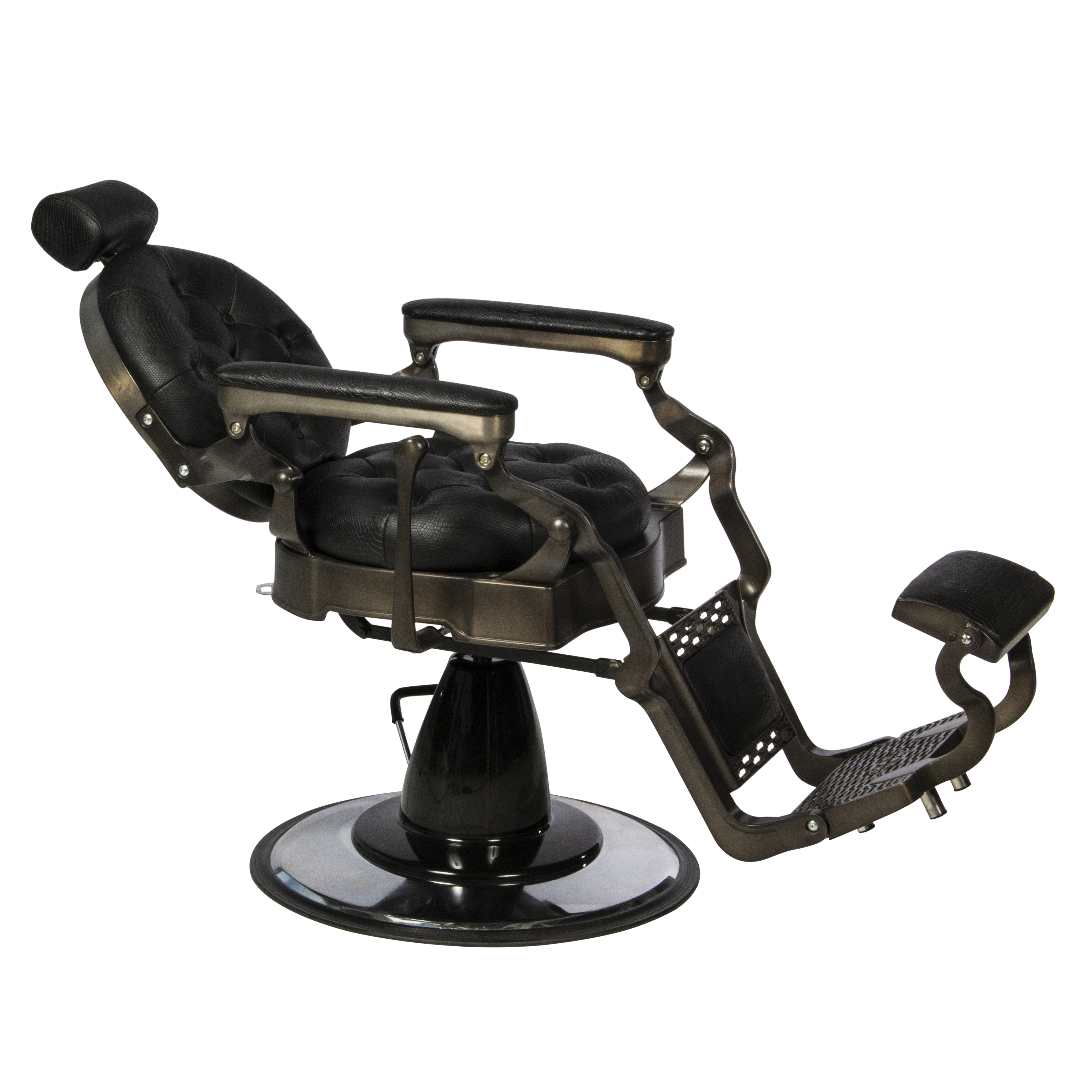 Tem base redonda cromada, com sistema hidráulico de ótima qualidade. O conforto no atendimento ao cliente está garantido pelo sistema de reclínio suave, com movimento simultâneo do encosto e do descanso de pés com alongador automático. Atende confortavelmente clientes de portes grandes e até 180 kg. Tem ainda um prático porta-capa.