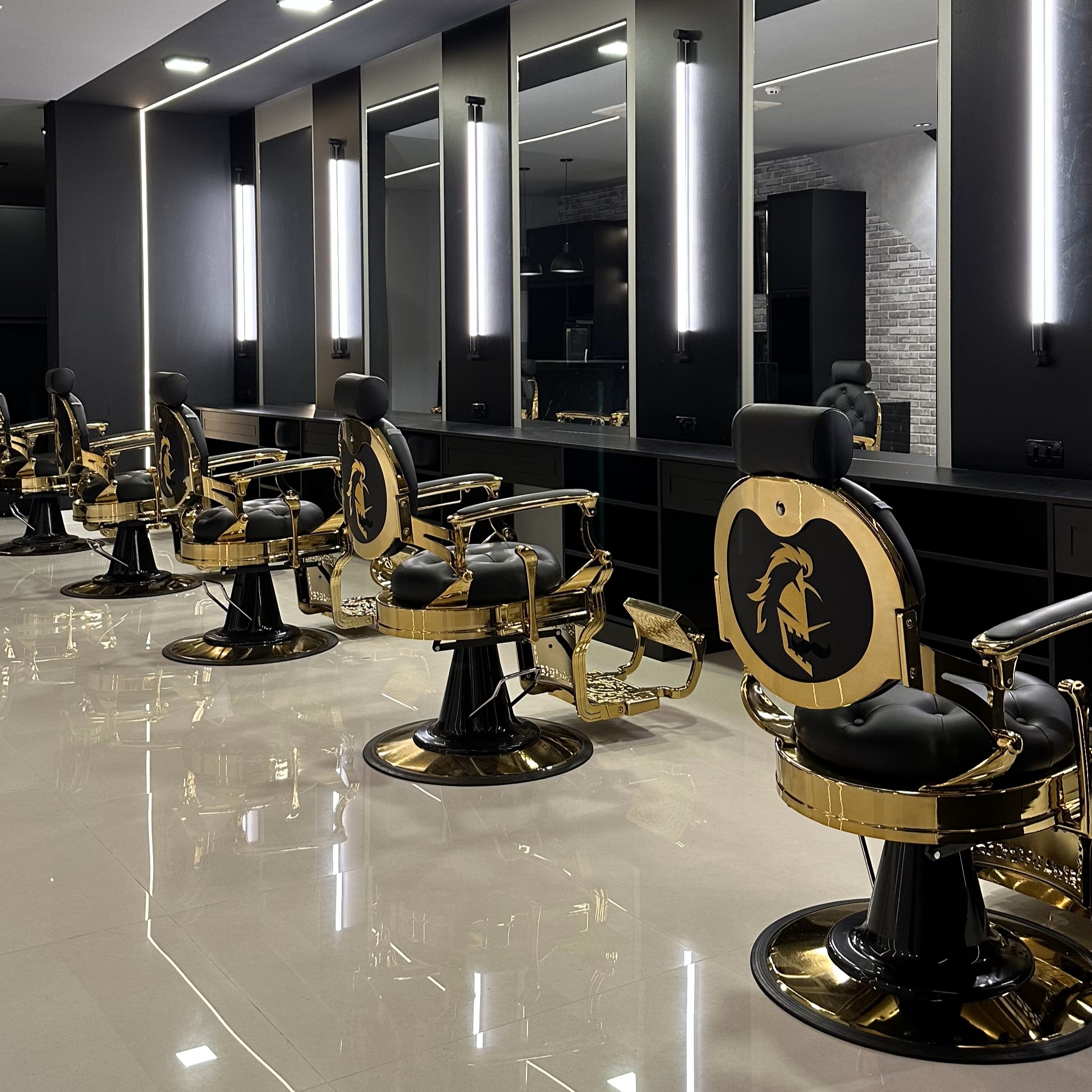 Barbearias que buscam estilo retrô refinado e querem ambiente diferenciado escolhem a Poltrona Netherland Gold, com estrutura de metal maciço e tratamento de superfície na cor ouro, que traz forte impacto no ambiente.